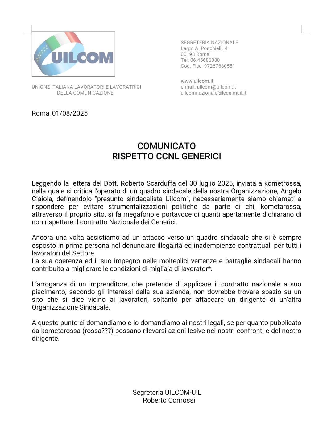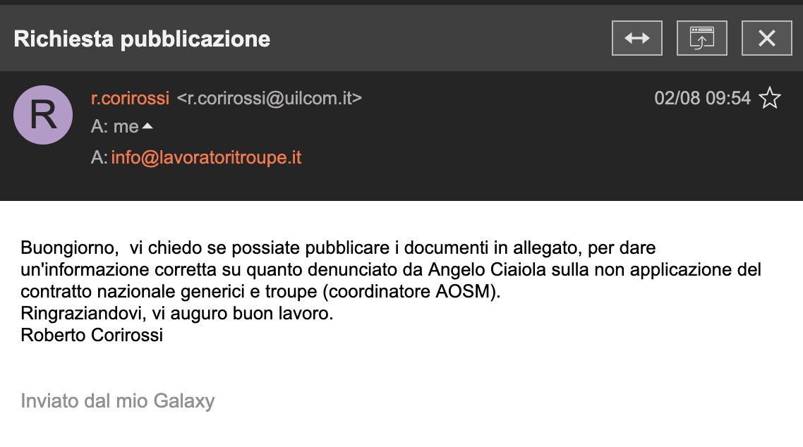 In fondo alleghiamo anche lo screenshot della richiesta di pubblicazione che ci è arrivata direttamente da Uilcom-UIL, che condividiamo per trasparenza.