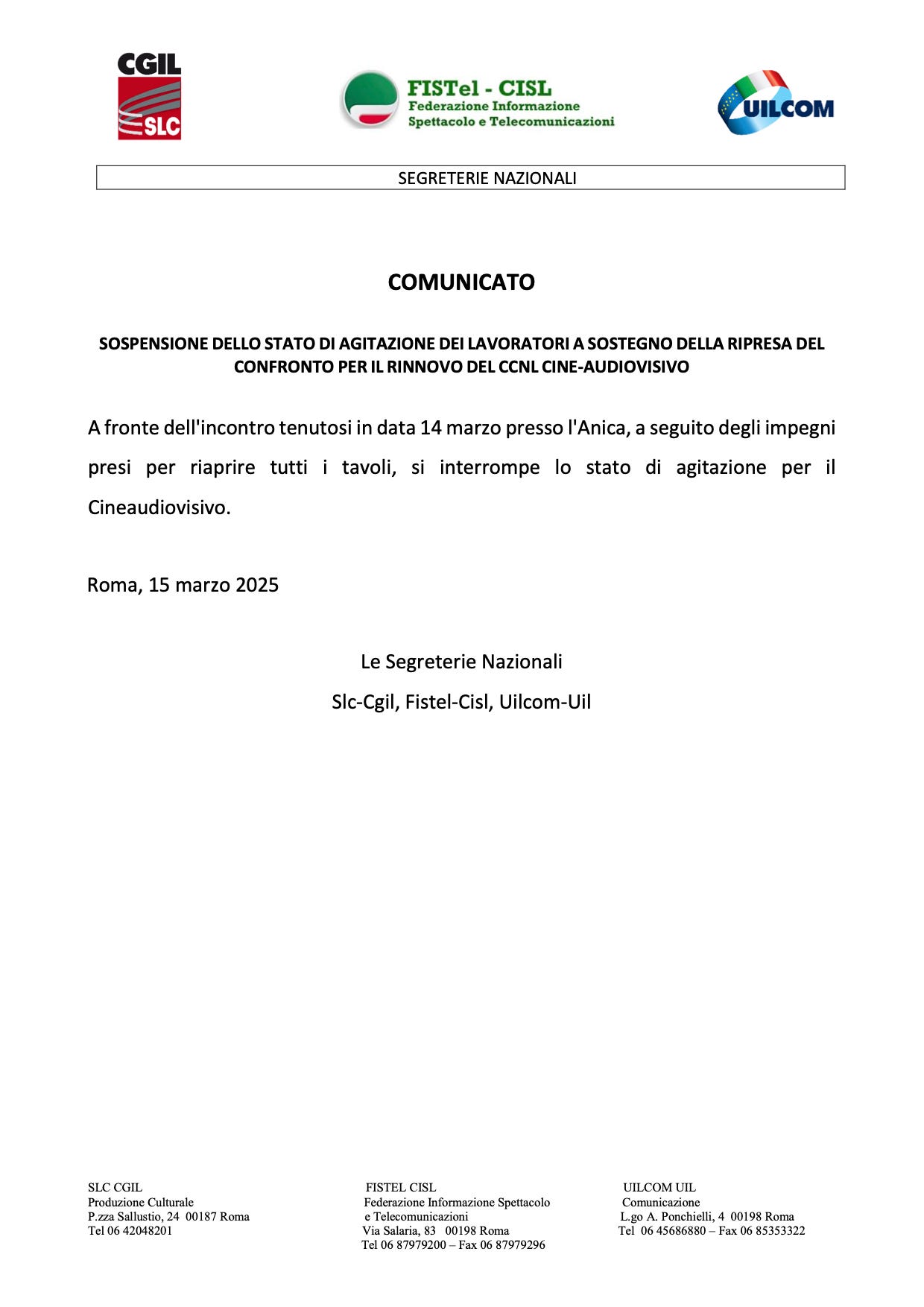 E dunque, a proposito di informazione, vi salutiamo con un comunicato congiunto delle tre sigle, fresco fresco di pochi minuti fa dove i sindacati sospendono lo stato di agitazione culminato ieri con un presidio organizzato da Slc-Cgil davanti alla sede di ANICA, in occasione della riapertura dei tavoli negoziali del Cine-audiovisivo.